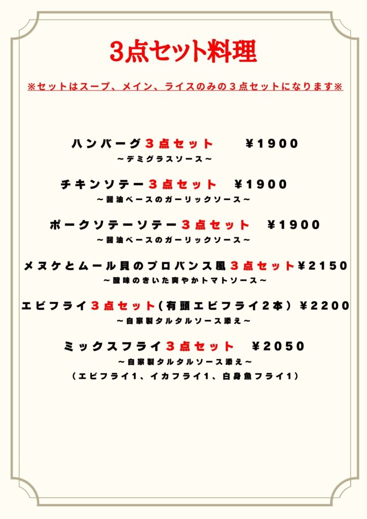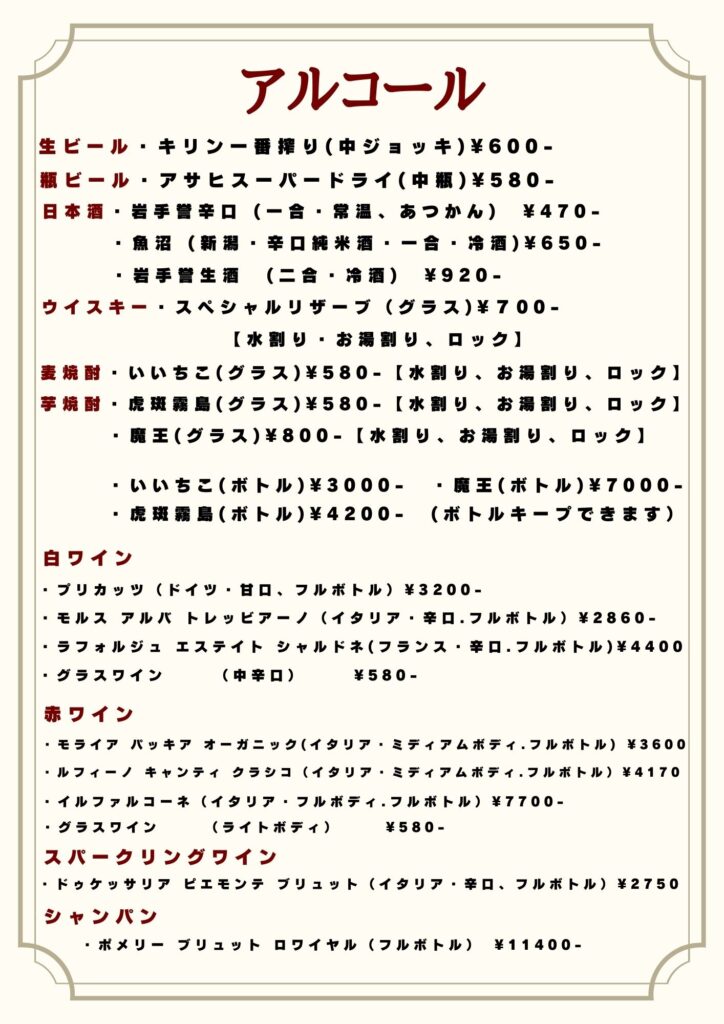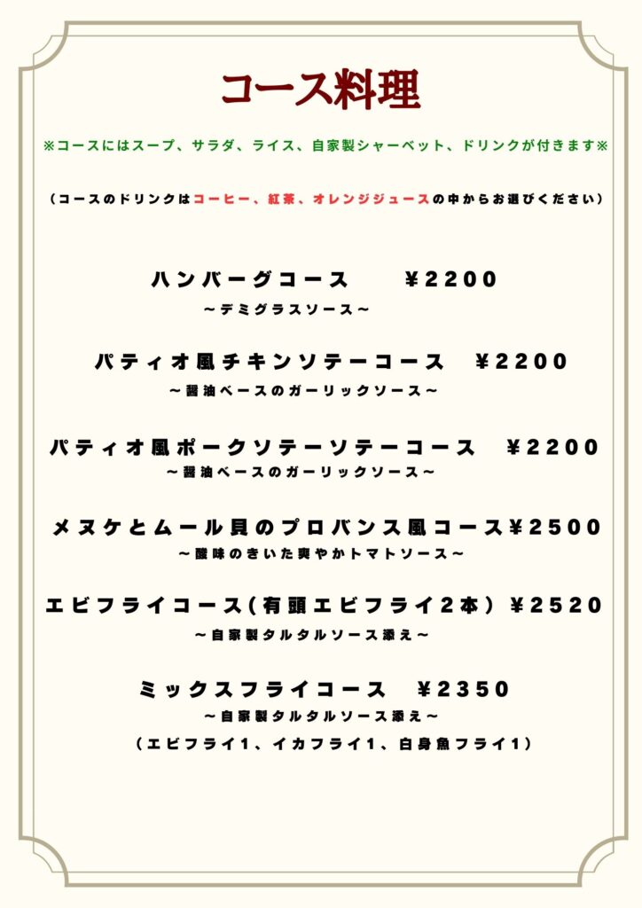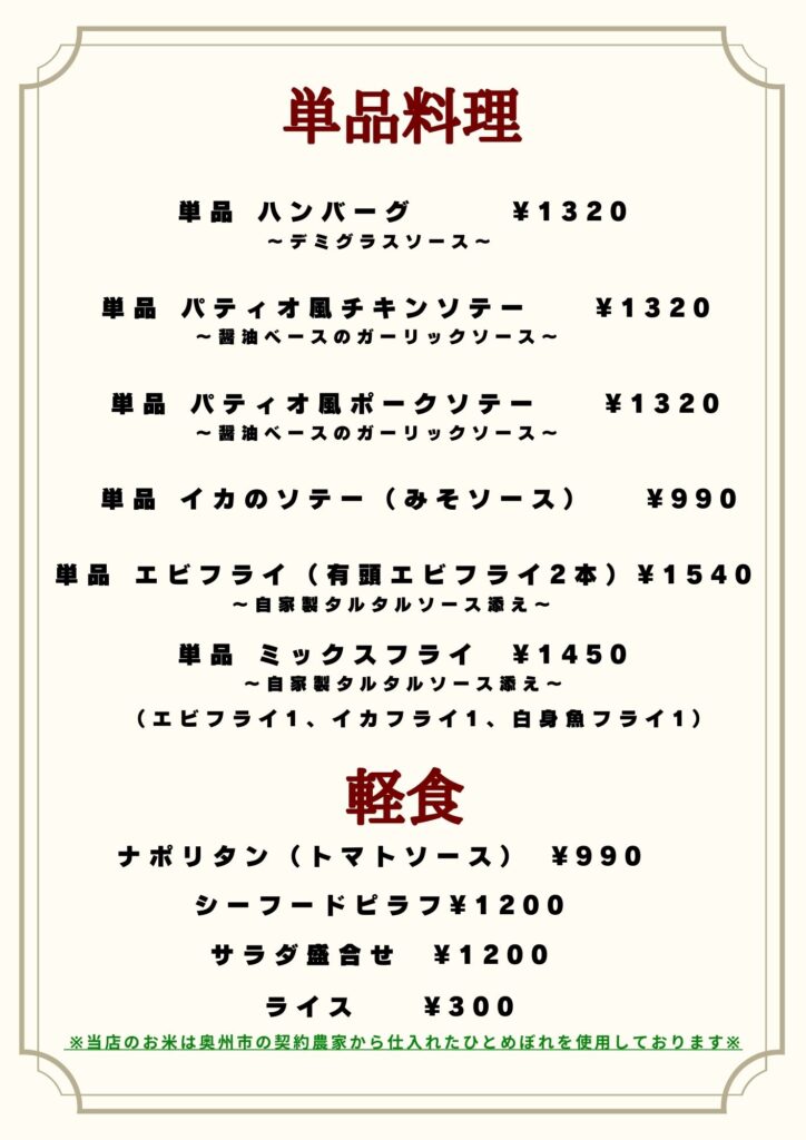 ※一部メニューや価格を変更している場合がございますので正確な情報は電話で直接お問い合わせください※